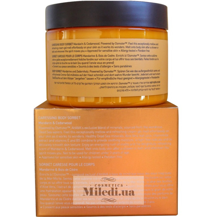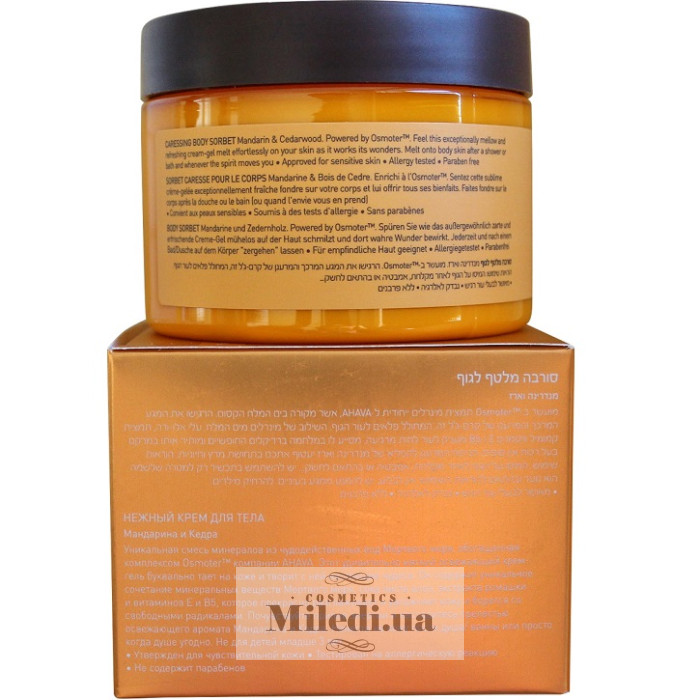 Крем-сорбет обладает нежной текстурой и ароматным, утонченным запахом с освежающими нотами мандарина, кедра и элегантного парфюма.