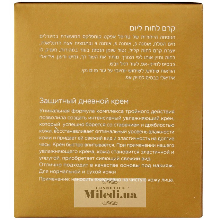 Израильский дневной крем оказывает общее увлажняющее и восстанавливающее воздействие на кожный покров. Он увлажняет эпидермис и устраняет дефицит влаги. Крем обладает легкой и приятной текстурой.