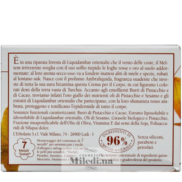 Крем для тела Амбровое дерево L`Erbolario Ambraliquida, 250 мл