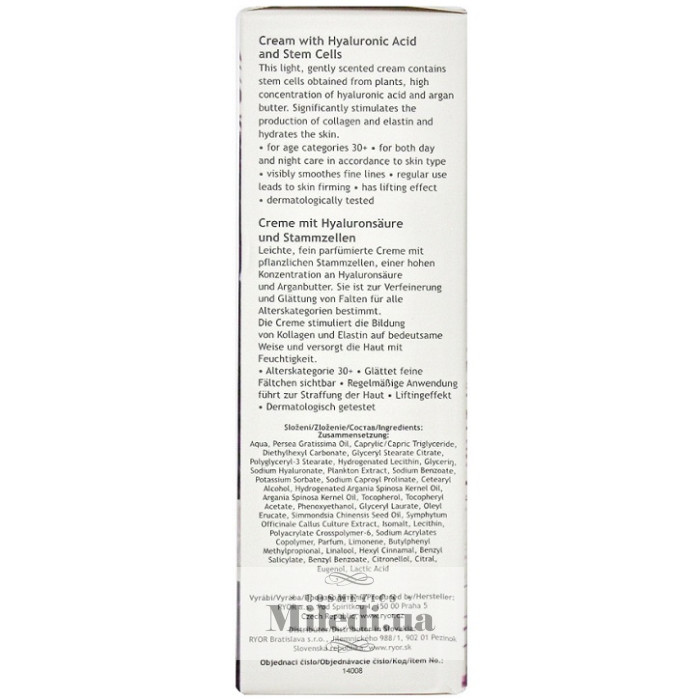 Крем для лица показан в антивозрастном уходе за кожей после 30-ти лет. Содержит высокую концентрацию 100% гиалуроновой кислоты, экстракта стволовых клеток и арганового масла.