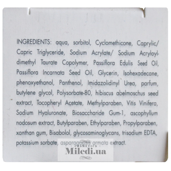 Гликозаминогликаны, масло маракуий (пассифлоры), масло семян страстоцвета, экстракты семян гибискуса, аспарагопсис армата (бурая водоросль), аскофилум нодосум (бурой водоросли), виноградных косточек, натрия гиалуронат, пантенол, бисаболол