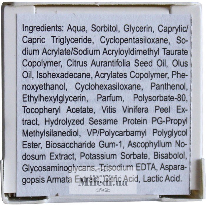 Масло семян лайма, масло семян рапса, пантенол, токоферола ацетат, экстракт кожуры красного винограда, гидролизованный белок кунжута, экстракт бурой водоросли, бисаболол, гликозаминогликаны, экстракт красных водорослей, лимонная кислота, молочная кислота