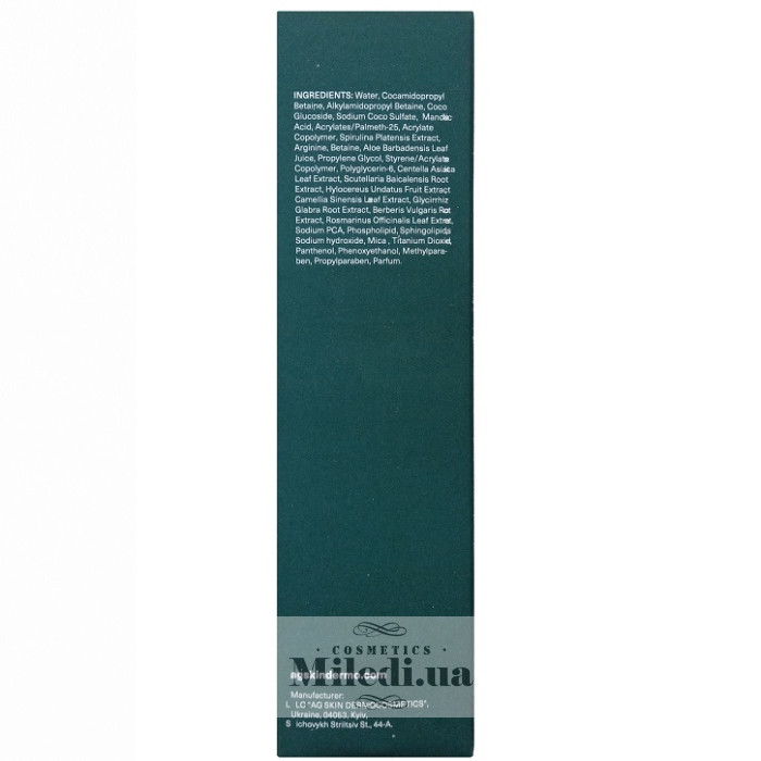Water, Cocamidopropyl Betaine, Alkylamidopropyl Betaine, Coco Glucoside, Sodium Coco Sulfate, Mandelic Acid, Acrylates/Palmeth-25, Acrylate Copolymer, Spirulina Platensis Extract, Arginine, Betaine, Aloe Barbadensis Leaf Juice, Propylene Glycol, Styrene/Acrylates Copolymer, Polyglycerin-6, Centella Asiatica Leaf Extract, Scutellaria Baicalensis Root Extract, Hylocereus Undatus Fruit Extract, Camellia Sinensis Leaf Extract, Glycirrhiza Glabra Root Extract, Berberis Vulgaris Root Extract, Rosmarinus Officinalis Leaf Extract, Sodium PCA, Phospholipid, Sphingolipids, Sodium hydroxide, Mica, Titanium Dioxide, Panthenol, Phenoxyethanol, Methylparaben, Propylparaben, Parfum