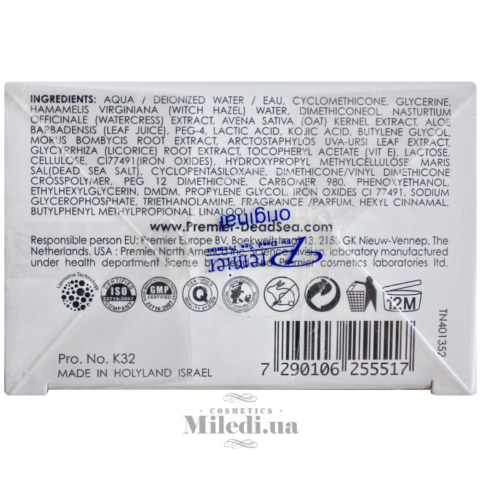 Вода и экстракт из семян миндаля, вода и фруктовый экстракт аниса, экстракт овса, ретинол, токоферол, лактоза, целлюлоза, экстракт римской ромашки, экстракт гамамелиса, липосомный комплекс - экстракт гинкго-билоба, масло мускусной розы, лецитин, экстракт алоэ барбадосского, бета-каратин, мочевина, молочная и лимонная кислоты, минералы и вода Мертвого моря
