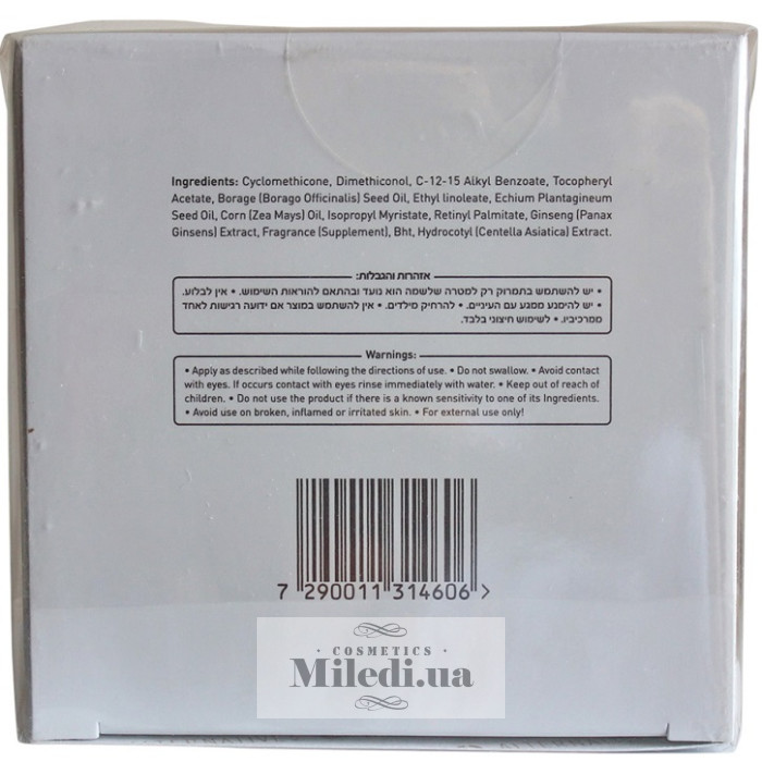 Минералы Мертвого моря, витаминный коктейль (А, Е, F), кислоты Омега-3, экстракты женьшеня, центеллы азиатской, масло семян бурачника
