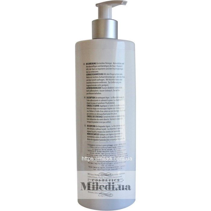 Оно тщательно удаляет любые загрязнения с ее поверхности, включая остатки макияжа. Очищающее профессиональное молочко увлажняет и смягчает деликатную кожу, оказывая мягкое противо воспалительное действие. Натуральный экстракт цветков мальвы, входящий в его состав, формирует на поверхности кожи защитный барьер, уменьшающий потерю влаги.