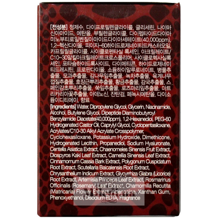 Гліцерин, ніацинамід, дипептид діамінобутіроіл, бензамідамідіацетат (40,000 М.Д.), 12-гександіол, гідрогенізований лецитин, пропандіол, гіалуронат натрію, екстракт центелли азіатської, екстракт фруктів айви китайської, екстракт листя хурми, екстракт листя камелії, екстракт кори коричника китайського, екстракт коренів рейнутріі японської, екстракт кореня шоломниці байкальської, екстракт хризантеми, екстракт коренів лакриці, екстракт артемізії принцепса, екстракт листя розмарину, екстракт квітки ромашки, аденозин