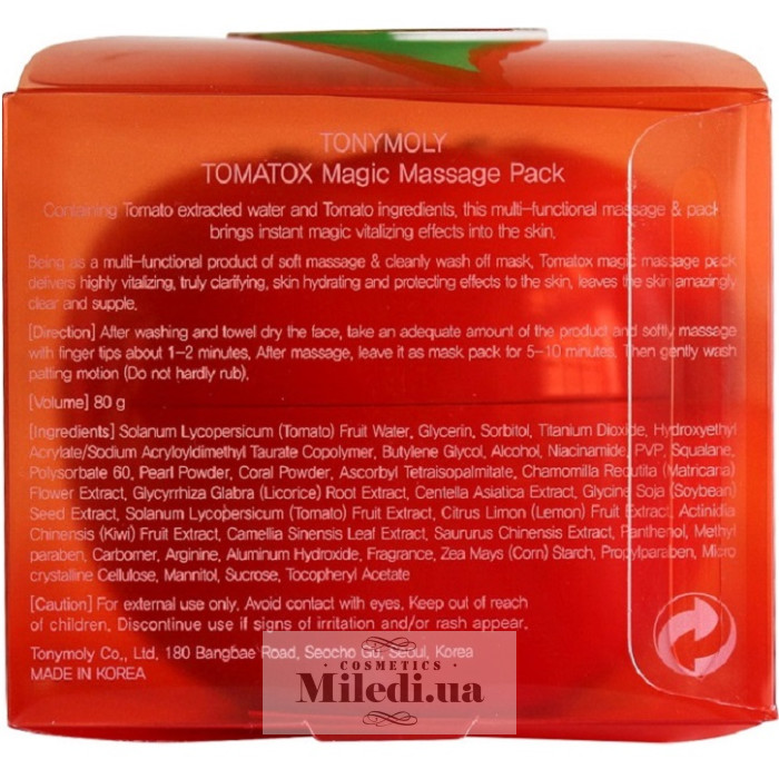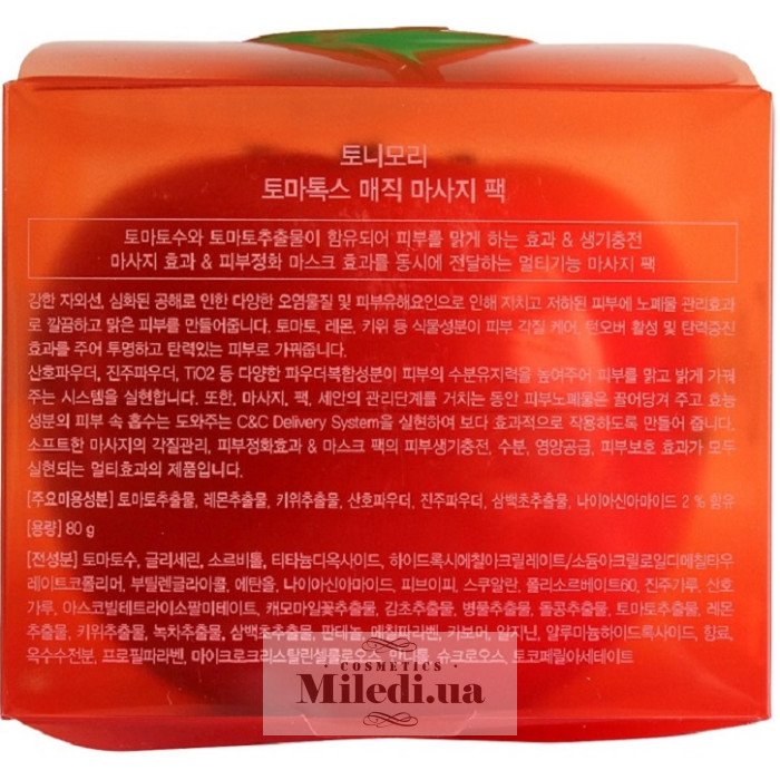 Освітлювальна масажна детокс маска виготовлена у формі стиглого помідора. Вона рекомендована у догляді за всіма типами шкіри. Її використання добре вирівнює тон шкіри, покращує колір обличчя, виводить токсини та зменшує набряклість.
