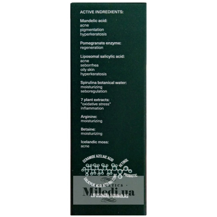 Мигдалева кислота, саліцилова кислота, ферментований екстракт гранатових плодів, ензими лактобактерій, екстракт спіруліни, ісландський мох, екстракти камелії, кореня солодки, центелли азіатської, кореня барбарису, шлемника, фрукта дракона, розмарину, аргінін, бетаїн