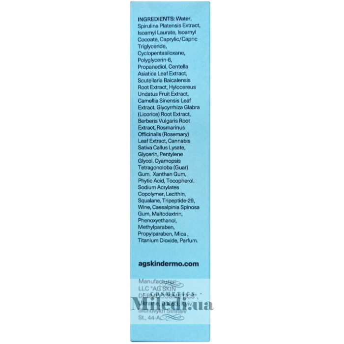 Water, Spirulina Platensis Extract, Isoamyl Laurate, Isoamyl Cocoate, Caprylic/Capric Triglyceride, Cyclopentasiloxane, Polyglycerin-6, Propanediol, Centella Asiatica Leaf Extract, Scutellaria Baicalensis Root Extract, Hylocereus Undatus Fruit Extract, Camellia Sinensis Leaf Extract, Glycyrrhiza Glabra (Licorice) Root Extract, Berberis Vulgaris Root Extract, Rosmarinus Officinalis (Rosemary) Leaf Extract, Cannabis Sativa Callus Lysate, Glycerin, Pentylene Glycol, Cyamopsis Tetragonoloba (Guar) Gum, Xanthan Gum, Phytic Acid, Tocopherol, Sodium Acrylates Copolymer, Lecithin, Squalane, Tripeptide-29, Wine, Caesalpinia Spinosa Gum, Maltodextrin, Phenoxyethanol, Methylparaben, Propylparaben, Mica , Titanium Dioxide, Рarfum