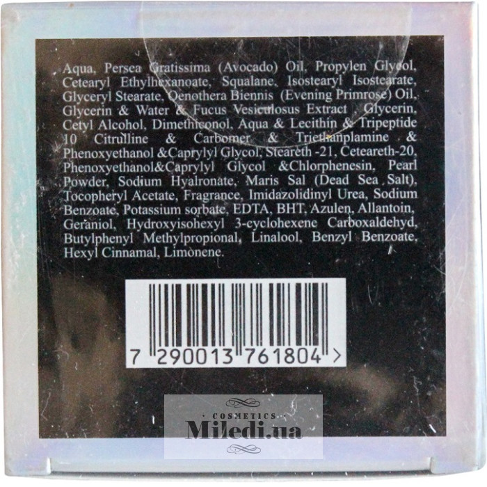 Демінералізована вода, олія авокадо, перловий порошок, сквалан, олія енотери, екстракт морських водоростей, гліцерин, гіалуронова кислота, вітамін Е, мінерали Мертвого моря, алантоїн, вітамін А, арахідонова кислота, лецитин