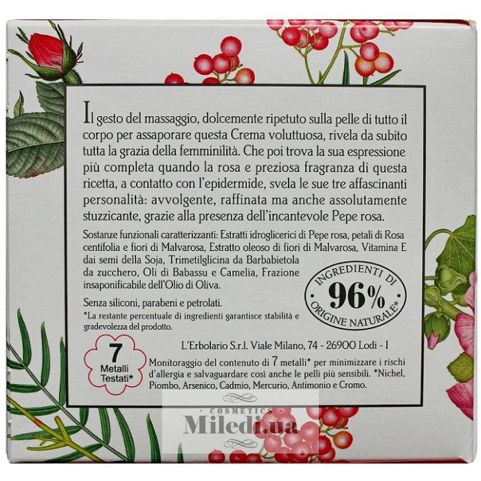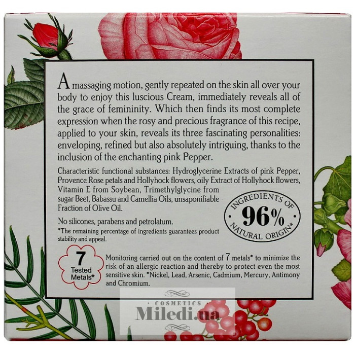 Парфумований крем містить високу концентрацію натуральних інгредієнтів на 100% рослинній основі. Він має ніжну текстуру, яка м'яко ковзає по шкірі й швидко вбирається.