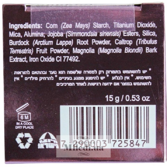 Крохмаль кукурудзи цукрової, титаниум діоксид, міка, ефіри хохоби, оксид залізу, оксид кремнію, екстракт кори магнолії, порошок лопуху і екстракт сапоніни