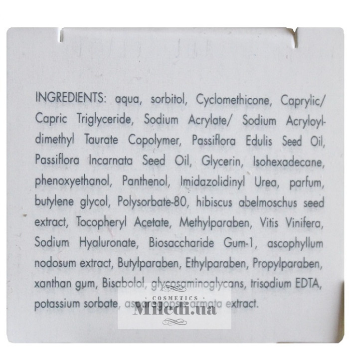 Глікозаміноглікани, олія маракуйя (пасіфлори), олія насіння страстоцвіту, екстракти насіння гібіскусу, аспарагопсіс гармата (бура водорість), аскофілум нодосум (бурої водорості), виноградних кісточок, натрію гіалуронат, пантенол, бісаболол