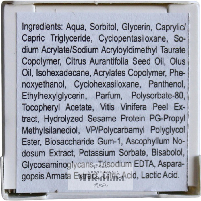 Олія насіння лайму, олія насіння ріпаку, пантенол, токоферолу ацетат, екстракт шкірки червоного винограду, гідролізований білок кунжуту, екстракт бурої водорості, бісаболол, глікозаміноглікани, екстракт червоних водоростей, лимонна кислота, молочна кислота