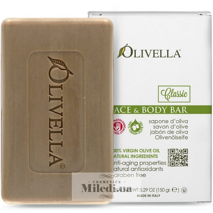 Мило є інноваційним косметичним продуктом зі 100% оливкової олії Virgin без застосування хімічних процесів. Воно не містить сульфатів, тваринних жирів, хімічних барвників. Рекомендоване для щоденного очищення обличчя та тіла. Воно збагачене антиоксидантами та поліфенолами.