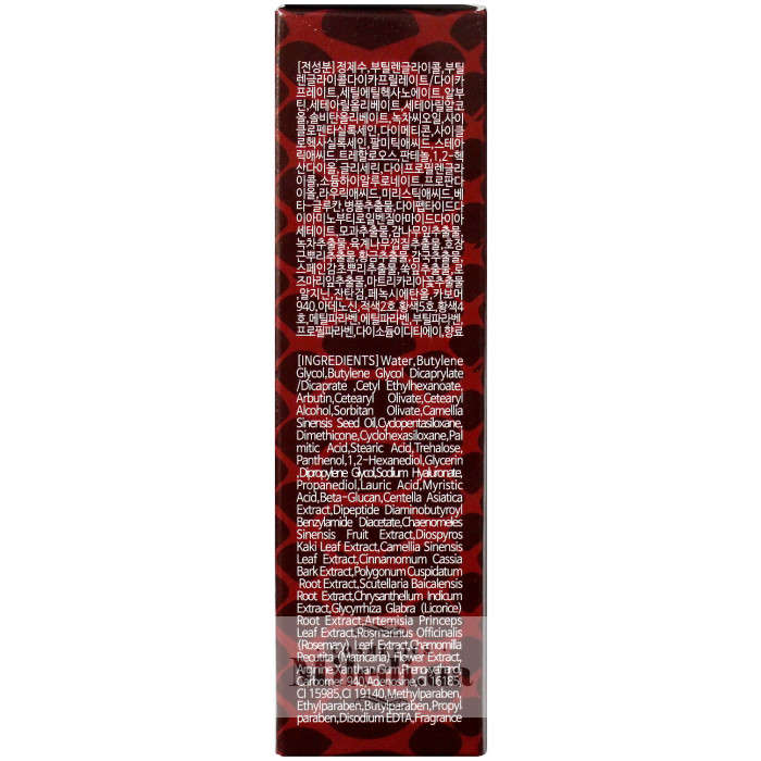 Вода, арбутин, цетеарил оліват, сорбітан оліват, масло камелії, декаметілціклопентасілоксан, цідонексасілоксан, пальмітічна кислота, стеаринова кислота, трегалоза, пантенол, 1,2-гександіол, гліцерин, гіалуронат натрію, пропандіол, лауриновая кислота, міристинова кислота, бета-глюкан, центела азіатська екстракт, дипептид діамінобутіроіл, бензамідамідіацетат, екстракт фруктів хеномелесу, екстракт листя хурми, камелії, екстракт листя коричника китайського, екстракт кори горця японського, кореневої екстракт шоломниці байкальської, екстракт хризантеми, екстракт лакриці, екстракт листя розмарину, екстракт квітки ромашки, аргінін, аденозин
