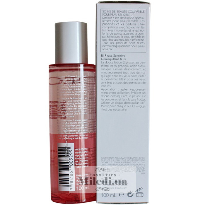 Двофазний демакіяж є делікатним очищаючим лосьйоном з пантенолом і гіалуроновою кислотою, що оновлює. Засіб легко видаляє забруднення будь-якої складності, у тому числі водостійкий макіяж. При використанні не дратує слизову та не висушує делікатну шкіру навколо повік.